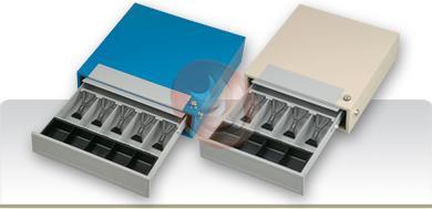 Gaveta de apertura mecánica. Modelos de 3, 4 y 5 divisiones tanto para monedas como billetes. Vista exterior, frente e ...